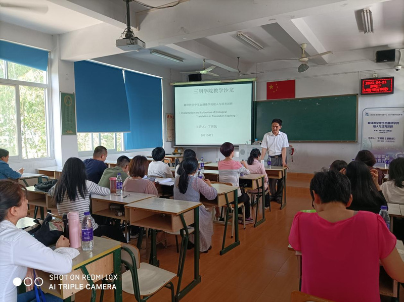 为了贯彻《教育部等六部门关于加强新时代高校教师队伍建设改革的指导意见》(教师〔2020〕10号)《Bwin必赢网址关于进一步加强本科教学工作提高人才培养质量的若干意见》(明院办发〔2017〕63号)文件精神,引导教师积极探索应用型人才培养目标、教学理念、教学方法的改革,促进各学院间、教师间跨学科沟通与交流,浓厚学校公司产品改革氛围,提升应用型人才培养质量。2021年4月21号下午,公司举办2021年首场题目为“翻译教学中生态翻译学的植入与培育深耕”英语教学沙龙活动,主讲人丁锡民。