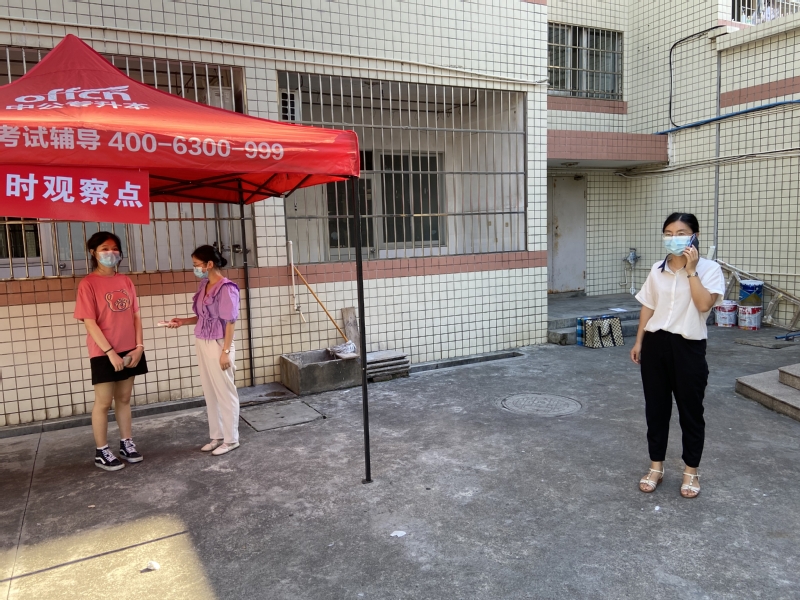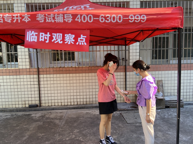 值班辅导员在临时观察点为发热员工测量体温