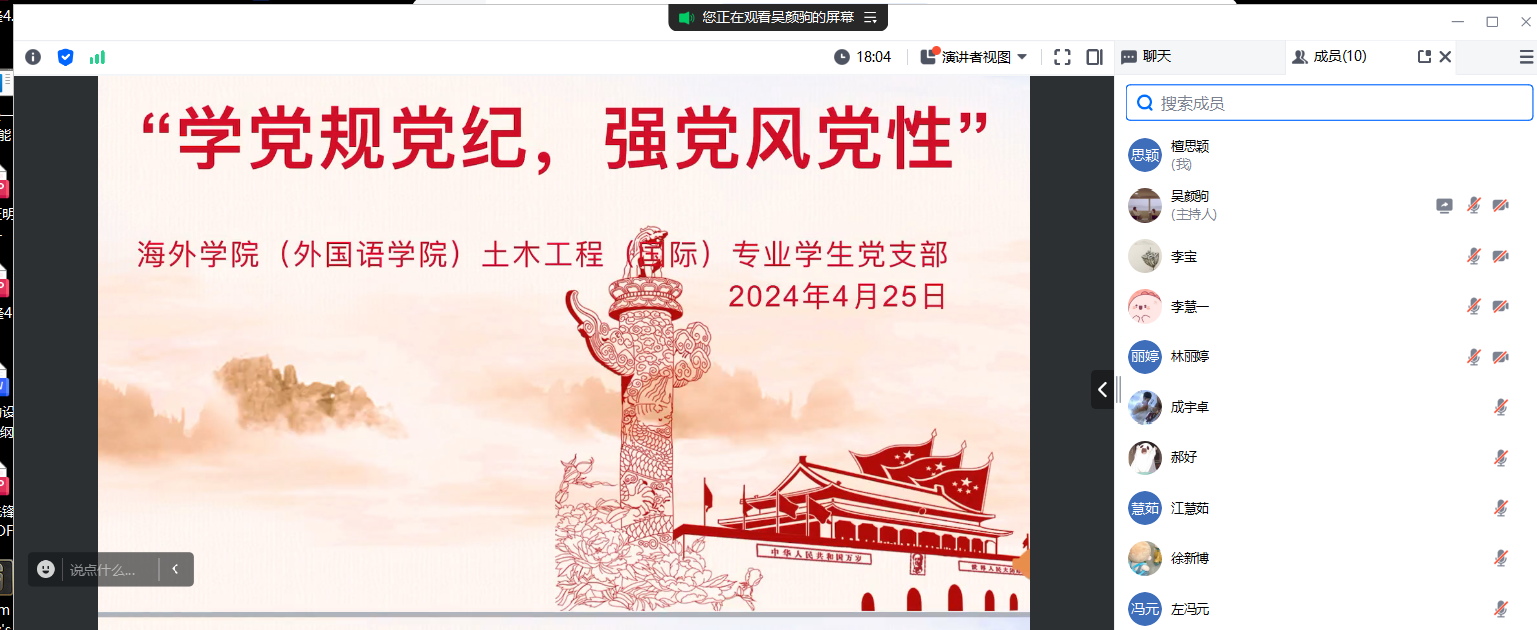 为进一步加强党纪学习教育,激励党员坚定理想信念,4月25日晚,土木工程(国际)专业员工党支部于鸿文楼(二)C107开展了学党规党纪,强党风党性主题活动,会议开始支部书记李宝带领全体与会党员对学习强国学习平台中党纪学习教育篇进行学习,并观看《百年“纪”忆》教育视频。